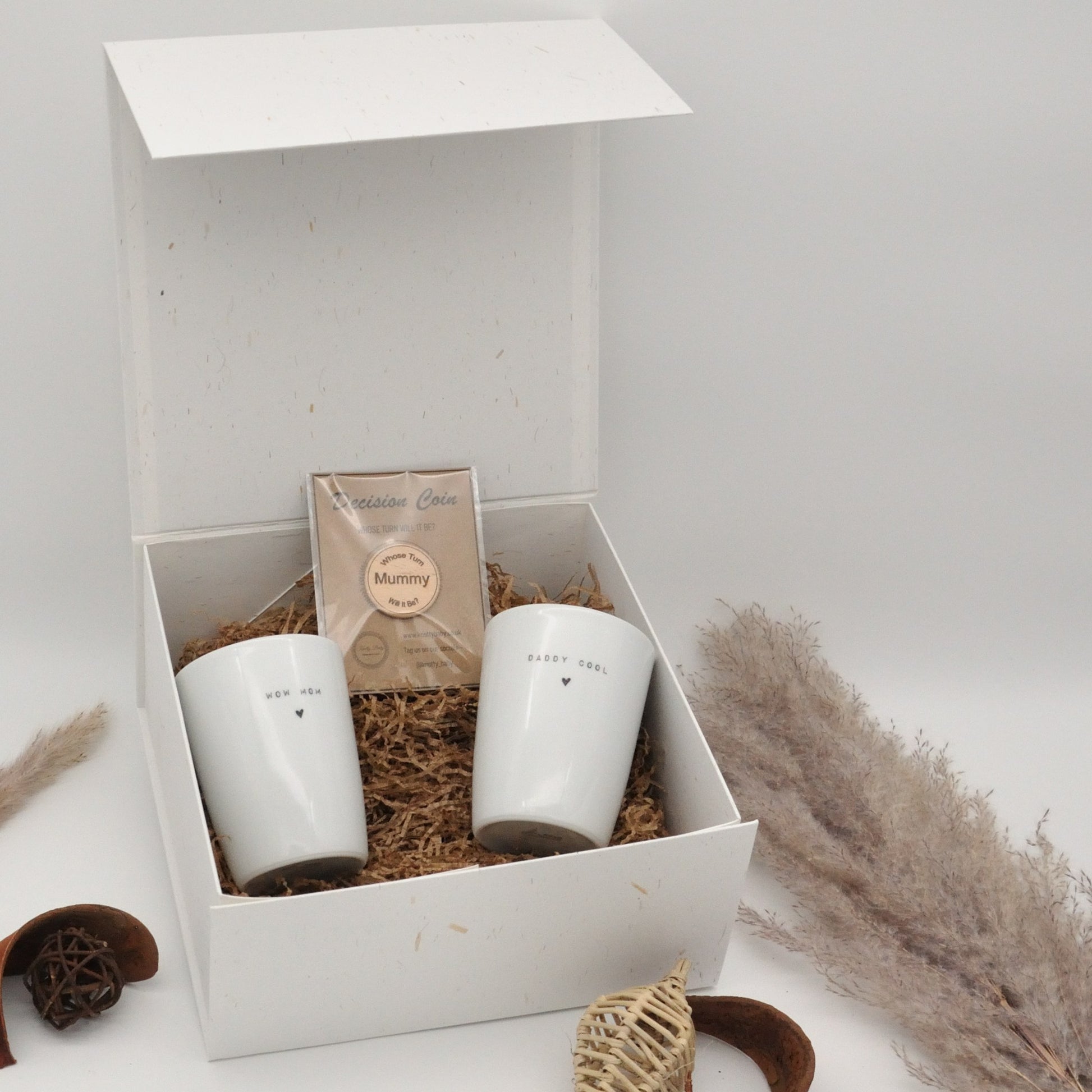 Life as a new parent can be stressful. A coffee or tea moment can provide the necessary calm. That's why this gift package contains two mugs with the inscriptions 'Wow Mom' and 'Daddy Cool'. In addition, we add a decision coin to fairly allocate the rest period to mom or dad.