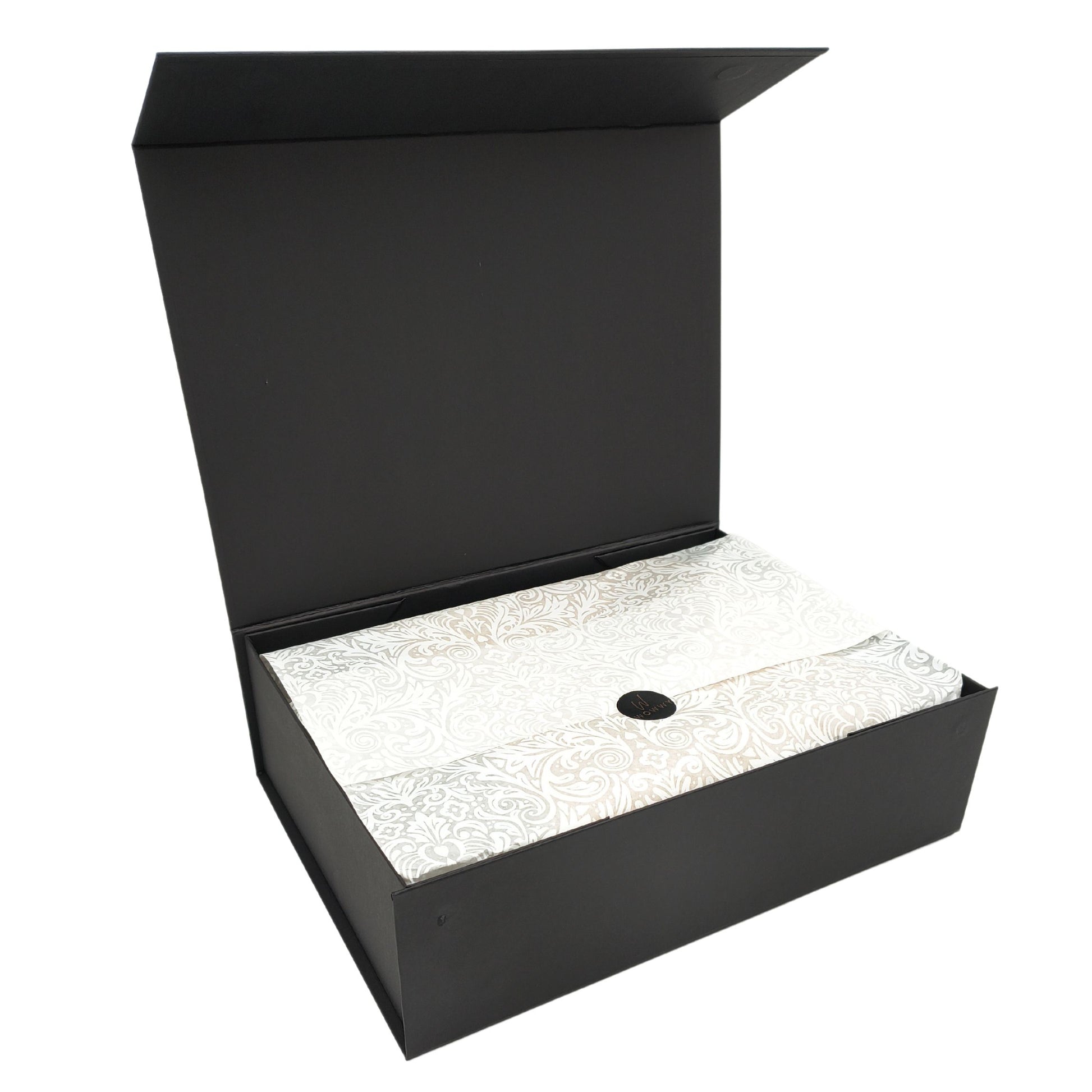 Eine schöne Geschenkbox von Wowwy mit luxuriösem, mattschwarzem Finish und beige Satinbandschleife, die direkt an die (werdende) Mama verschenkt werden kann. Die Produkte in der Geschenkbox sind in schönem weißen Seidenpapier mit Blumenmuster eingewickelt und mit einem schwarzen Wowwy-Aufkleber versehen.